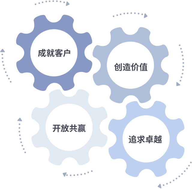 成就客户是一切决策的出发点,创造价值是衡量所有工作的标准,追求卓越是Cmp冠军做事做人的态度,开放共赢是Cmp冠军的格局也是最终的结果。价值观的齿轮环环相扣,推动着组织里的每个人不断向前。